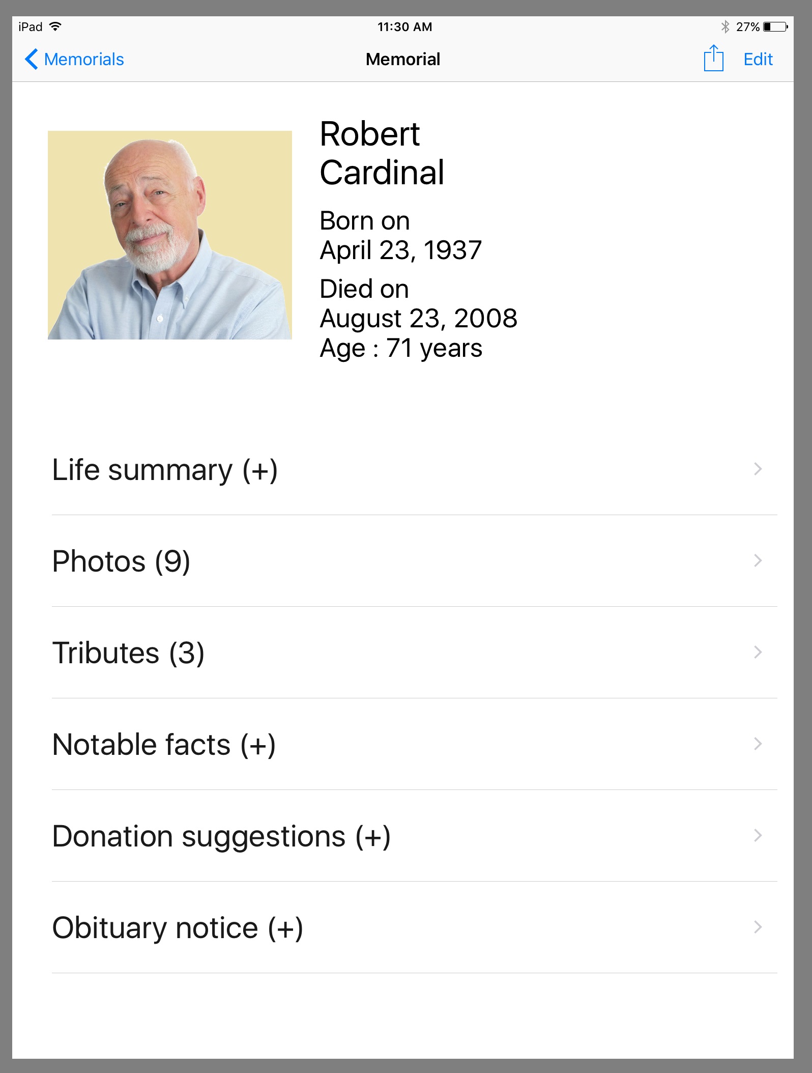 Memorials can also be distributed as PDF files, or on paper if you have a printer accessible from your iPhone or iPad. PDF and printed versions are particularly useful for your correspondents who want to keep a souvenir but not necessarily on iPhone or iPad.