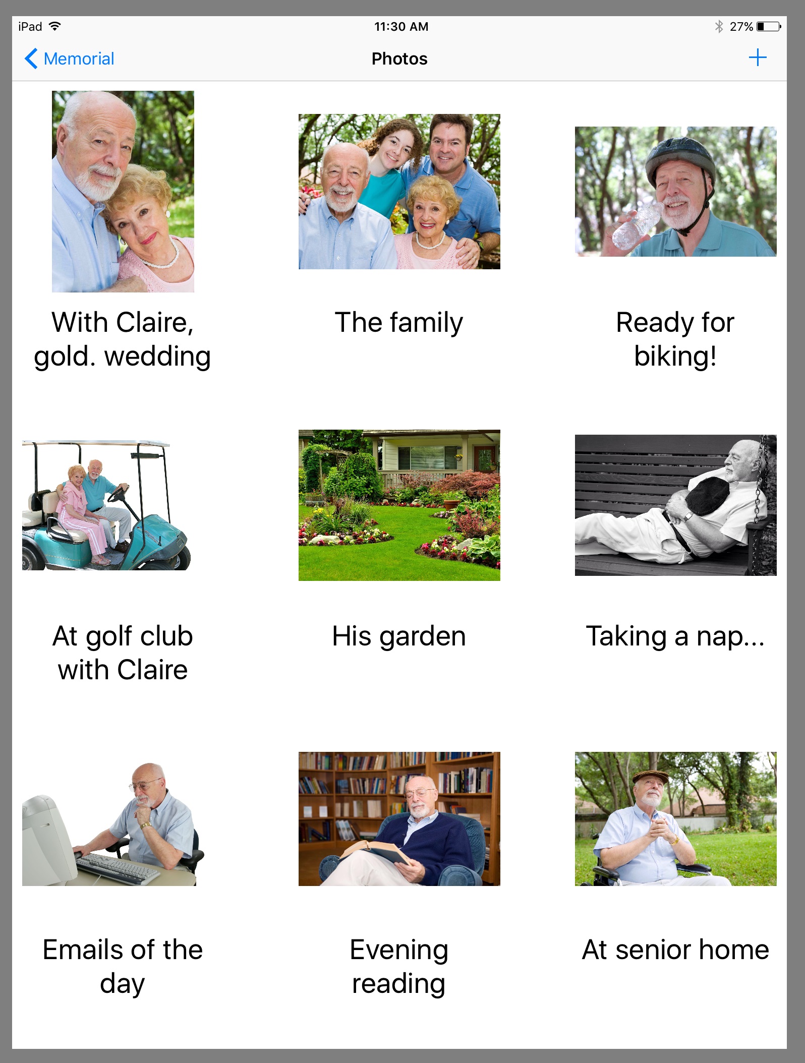 Photos can be imported from the albums on your iPhone or iPad. Should you wish, you can also use the camera, take a photo and add it directly to a memorial.