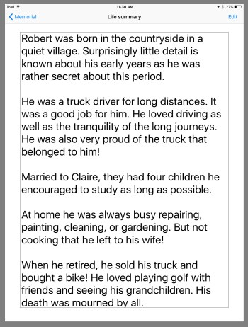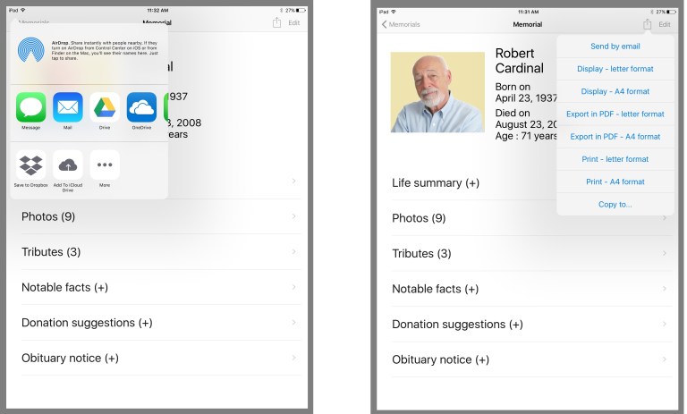 Memorials can also be distributed as PDF files, or on paper if you have a printer accessible from your iPhone or iPad. PDF and printed versions are particularly useful for your correspondents who want to keep a souvenir but not necessarily on iPhone or iPad.