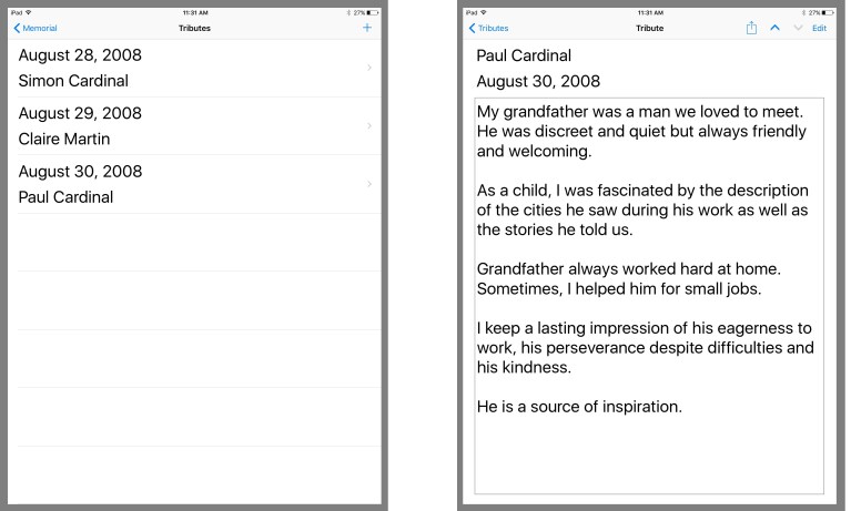 Memorials are personal. They are stored on your iPhone or iPad and not on a web server. This allows you to view them at any time without an Internet or cellular connection. In addition, you can write whatever you want according to your tastes and feelings.